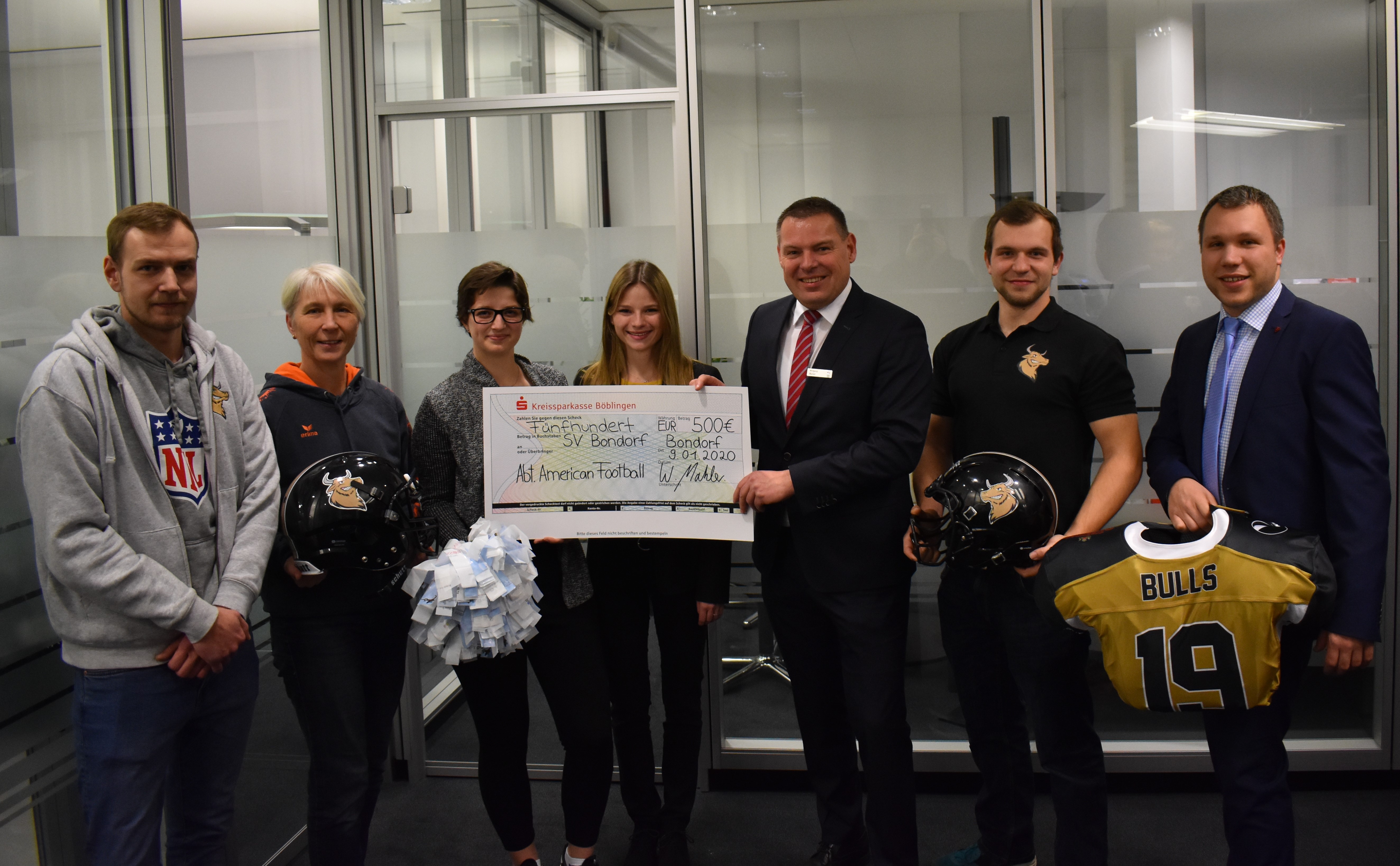 Damit unsere Cheerleader erfolgreich trainieren und auftreten können, sind größere Anfangsinvestitionen, wie der Kauf von Uniformen, PomPons, Trainingsjacken, etc. nötig. Ohne die finanzielle Unterstützung durch Sponsoren und Spenden ist dieses Vorhaben schwer umsetzbar. Die Kreissparkasse in Bondorf hat sich bereiterklärt, unsere noch junge Abteilung, zu unterstützen. Der Spendenscheck über 500€ wurde uns am 9.Januar durch Herrn Wolfgang Mahler (Filial-Center Leiter Bondorf) überreicht. Für diese Unterstützung möchten wir uns bei Herrn Mahler und der Kreissparkasse herzlich bedanken.